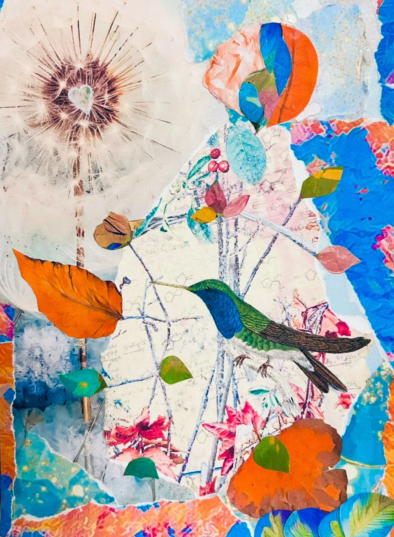 Collage is a gift to struggling souls for getting emotions outside of ourselves to be able to look at them and gain insight. It is a freeing art process because there are no mistakes. The pieces of paper tell us where they belong—FOR us. To me, this process is connected to the Divine.